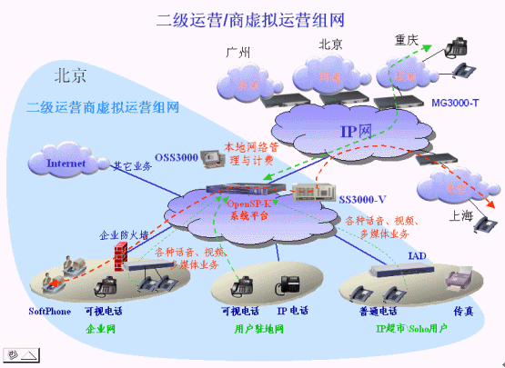 對(duì)于想在全國(guó)范圍內(nèi)運(yùn)營(yíng)的虛擬運(yùn)營(yíng)商,在總部放置一套SS3000-V,同時(shí)在有用戶群的區(qū)域的用戶網(wǎng)內(nèi)放置VSS-trans,以解決公網(wǎng)-私網(wǎng)及私網(wǎng)-私網(wǎng)之間的NAT/PAT穿越。為了解決長(zhǎng)途問(wèn)題,在各地放置MG3000-T實(shí)現(xiàn)長(zhǎng)途落地。為了保證語(yǔ)音質(zhì)量,通常虛擬運(yùn)營(yíng)商通過(guò)自己的IP網(wǎng)或租用VPN等,沒(méi)有相關(guān)資源時(shí)也可以通過(guò)Internet將各地聯(lián)系起來(lái),通過(guò)在各分部放置FXO口IAD或MG3000-T可以實(shí)現(xiàn)長(zhǎng)途零話費(fèi),利用各地網(wǎng)關(guān)相互落地,從而實(shí)現(xiàn)撥叫其他區(qū)域的外網(wǎng)用戶只需付市話費(fèi)。這樣就為虛擬運(yùn)營(yíng)提供了很好的競(jìng)爭(zhēng)基礎(chǔ),開(kāi)拓了廣闊的利潤(rùn)空間。