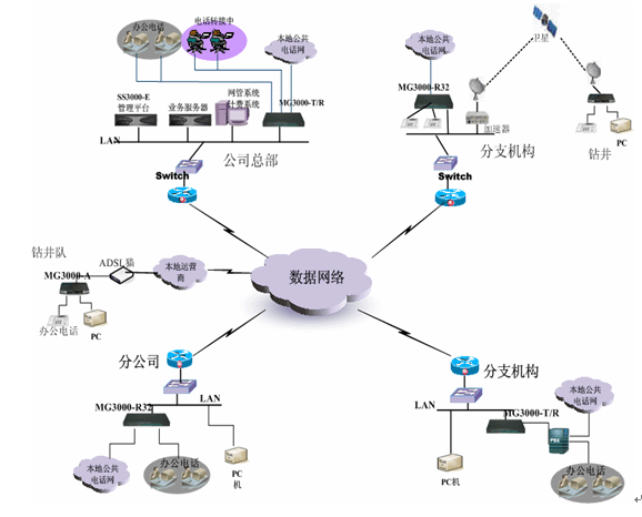 對規(guī)模比較小的辦事處,或者遠端的鉆井隊,一般在本地都是采用ADSL接入這樣方式,這樣情況可以直接配置MG3000-A語音往關,實現(xiàn)語音數(shù)據(jù)同傳方式。MG3000-A提供1、4、8口多種方式供實際情況來選擇。所有的號碼可以直接在總部中心的平臺來分配控制。