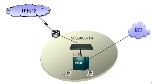 MG3000-T4提供1、2、4E1中繼,直接提供數(shù)字中繼口和PBX交換機對接,PBX交換機原有的撥號習慣和撥號方式不做改變,可以通過路由選擇的方式來走原來的PSTN網(wǎng)絡或者IP網(wǎng)絡,同時通過MG3000-T4來做電路交換和IP網(wǎng)的分組交換的轉換,實現(xiàn)該分支機構和其他分支機構的互連互通。