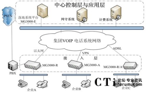 各單位利用自己的網(wǎng)絡(luò)組建集團(tuán)VOIP語(yǔ)音網(wǎng)絡(luò)。無論是在國(guó)內(nèi)的各單位總部及其分支還是海外的企業(yè)分支,不管是通過專網(wǎng)還是ADSL等連入集團(tuán)管理平臺(tái),都可以利用這個(gè)管理平臺(tái)傳輸語(yǔ)音業(yè)務(wù),總部和各分支機(jī)構(gòu)可以通過不同的網(wǎng)絡(luò)接入手段。