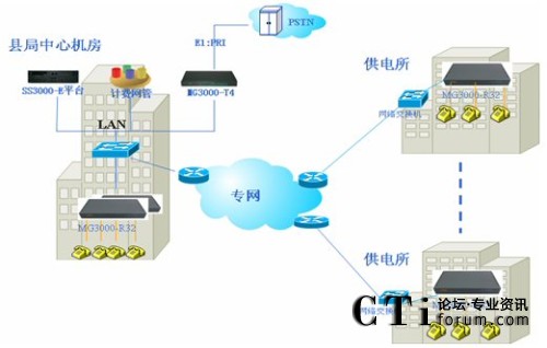 10個(gè)供電所部署MG3000-R32接入網(wǎng)關(guān),每個(gè)供電所提供1臺(tái)設(shè)備,支持32部電話接入。