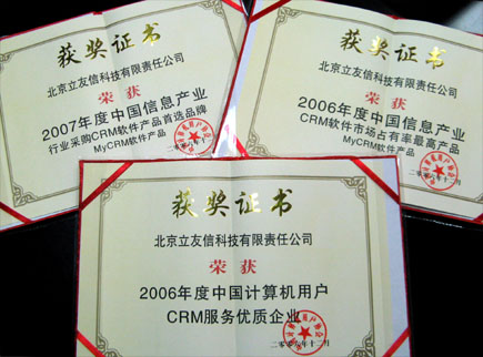 2007年1月16日,中國計算機用戶協(xié)會在京召開隆重而盛大的年度頒獎儀式。MyCRM在本次會上榮獲殊榮,一舉囊括了“2006年度中國信息產(chǎn)業(yè)CRM 軟件市場占有率最高產(chǎn)品”,“ 2006年度中國計算機用戶CRM服務優(yōu)質(zhì)企業(yè)”和“2007 年度中國信息產(chǎn)業(yè)行業(yè)采購CRM軟件產(chǎn)品首選品牌”。本次獲獎充分體現(xiàn)了MyCRM在CRM市場的全面領先優(yōu)勢。