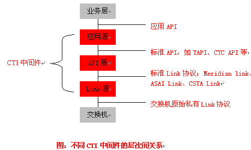 API層產(chǎn)品:實(shí)現(xiàn)把標(biāo)準(zhǔn)Link協(xié)議轉(zhuǎn)化為標(biāo)準(zhǔn)的API,如CTC API、TAPI、JTAPI等,為CTI應(yīng)用開(kāi)發(fā)提供一套標(biāo)準(zhǔn)的API,屏蔽了不同交換機(jī)擁有的CTI協(xié)議和CTI接口,使應(yīng)用程序員無(wú)需關(guān)心消息是如何在計(jì)算機(jī)和交換機(jī)之間傳遞,專注于客戶端的應(yīng)用開(kāi)發(fā),實(shí)現(xiàn)應(yīng)用程序與交換機(jī)平臺(tái)無(wú)關(guān)性。