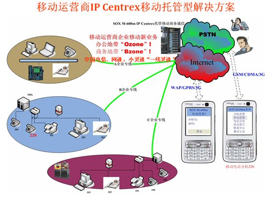 Mail,可發(fā)起WAP電話(huà)會(huì)議,可訪問(wèn)企業(yè)的CRM、ERP等應(yīng)用軟件并集成點(diǎn)擊呼叫等等)。不僅移動(dòng)運(yùn)營(yíng)商可以替代第一代的移動(dòng)總機(jī),固網(wǎng)運(yùn)營(yíng)商采用SOX-M移動(dòng)軟交換也可以輕松的開(kāi)展移動(dòng)總機(jī)(小靈通或手機(jī))的業(yè)務(wù)了,但SOX-M系統(tǒng)融合移動(dòng)運(yùn)營(yíng)商的無(wú)線互聯(lián)網(wǎng)數(shù)據(jù)業(yè)務(wù)將產(chǎn)生更大的利于企業(yè)應(yīng)用的前景,移動(dòng)總機(jī)(語(yǔ)音+WAP)的融合應(yīng)用成為第二代移動(dòng)總機(jī)殺手級(jí)應(yīng)用,令移動(dòng)總機(jī)如虎添翼。