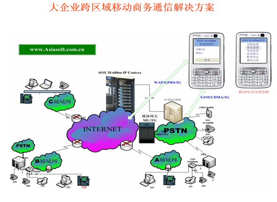 該方案為企業(yè)提供了跨地域的低成本、高效率、方便靈活的IP融合通信基本服務(wù)和增值服務(wù),使用SOX-M就不再有地域限制,宛如本地化電話(huà)分機(jī)辦公通信一樣,而且還可以享有更多的增值服務(wù):語(yǔ)音信箱、電話(huà)會(huì)議、一號(hào)通、等候音樂(lè)、語(yǔ)音菜單、呼叫篩選等等,更具特色的是提供了融合通信的新型“移動(dòng)總機(jī)”和“移動(dòng)分機(jī)”服務(wù),可以使我們手里的移動(dòng)電話(huà)(即手機(jī))完全成為辦公室分機(jī),可以在手機(jī)上完成固定分機(jī)的PBX特性功能,如在線轉(zhuǎn)接,即時(shí)會(huì)議等,通過(guò)SOX-M可以直接管理分機(jī)各種設(shè)置,如“來(lái)電管理、手機(jī)聽(tīng)取語(yǔ)音留言、WAP上召開(kāi)電話(huà)會(huì)議、聯(lián)系中心(CRM)WAP點(diǎn)擊呼叫”等等,實(shí)現(xiàn)了語(yǔ)音和數(shù)據(jù)融合通信給企業(yè)帶來(lái)的更多好處。