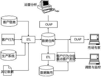 數(shù)據(jù)主要有四個方面的來源:客戶信息、客戶行為、生產(chǎn)系統(tǒng)和其它相關(guān)數(shù)據(jù)。這些數(shù)據(jù)通過抽取、轉(zhuǎn)換和裝載過程,形成數(shù)據(jù)倉庫,并通過OLAP和報表,將客戶的整體行為分析和企業(yè)運(yùn)營分析等傳遞給數(shù)據(jù)倉庫用戶。