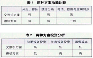 一般來說,最能影響呼叫中心運行能力的功能特征有3個方面:分組排隊功能、統(tǒng)計分析功能以及電話、數據與應用的同步功能。上述兩種方案比較列于表1和表2。