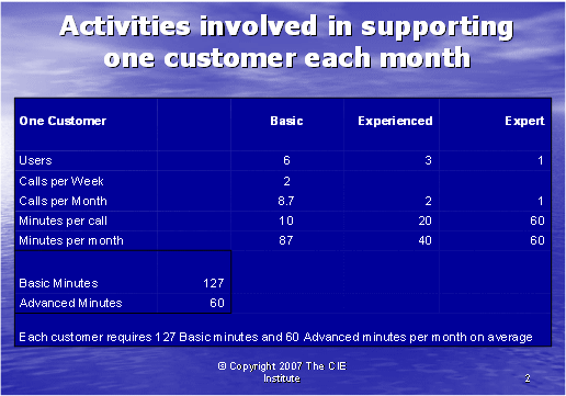 圖表1為我們提供了重要的信息,有助于我們計算一般的客戶在基礎和高級兩種技術支持中所需的技術支持的通話時長。我們需要區(qū)分這兩種技術支持,因為提供高級技術支持的座席的月薪是2000美元,比提供基礎技術支持,月薪為1000美元的座席每月所花的成本要高。那么,面臨有經(jīng)驗的客戶使用者時該怎么做呢?因為只有專業(yè)客戶使用者才能要求高級座席支持,所以他們的需要似乎可以由與初級客戶使用者打交道的基礎座席處理。