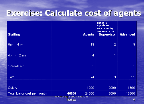 我們下一步就是計算出主管的成本。每次排班至少需要一個主管,如果這一排班的座席數(shù)要少一些,主管則也應該能夠處理一些技術支持的電話。在這個例子中,我們將假設主管擁有高級支持座席的技術技巧。在圖表5中,你將看到我們使用了圖表4所得出的座席數(shù),并假設這是每次排班話務量中所需的各種類型員工的數(shù)量:基礎,高級和主管。我們同時用圖表1中的薪資去計算座席和主管支持400個客戶的總成本。通過把每種座席單獨的成本相加(24個基礎座席,11個高級座席和3個主管),得出每月的人工成本為46,500美元。