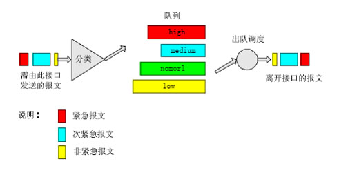 在報(bào)文到達(dá)路由設(shè)備接口后首先對(duì)報(bào)文進(jìn)行分類,然后按照?qǐng)?bào)文所屬的類別讓報(bào)文進(jìn)入所屬隊(duì)列的尾部,在報(bào)文發(fā)送時(shí)按照優(yōu)先級(jí)總是在所有優(yōu)先級(jí)較高的隊(duì)列中的報(bào)文發(fā)送完畢后再發(fā)送低優(yōu)先級(jí)隊(duì)列中的報(bào)文,這樣在每次發(fā)送報(bào)文時(shí)總是將優(yōu)先級(jí)高的報(bào)文先發(fā)出去,保證了屬于較高優(yōu)先級(jí)隊(duì)列的報(bào)文有較低的時(shí)延與丟失率。