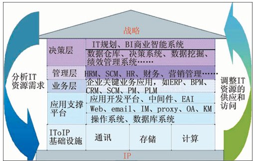 按照華為3Com的構(gòu)想,如果把整個IT系統(tǒng)比做一座房屋,那么整個房屋的地基就是IP網(wǎng)絡(luò),需要基于IP網(wǎng)絡(luò)來構(gòu)建通信、存儲、計(jì)算等IT基礎(chǔ)設(shè)施。在這些基礎(chǔ)設(shè)施之上,則是應(yīng)用支撐平臺(操作系統(tǒng)、數(shù)據(jù)庫系統(tǒng)、應(yīng)用開發(fā)平臺等),基于應(yīng)用支撐平臺提供給機(jī)構(gòu)的關(guān)鍵業(yè)務(wù)流程信息系統(tǒng)(如ERP、SCM等),最終為用戶的管理和決策提供支持!霸趹(zhàn)略與IT基礎(chǔ)設(shè)施之間實(shí)現(xiàn)實(shí)時同步互動,IT為用戶高層提供商業(yè)智能系統(tǒng)、決策系統(tǒng),以便決策層即時掌握信息,作為機(jī)構(gòu)戰(zhàn)略決策、戰(zhàn)略挑戰(zhàn)的依據(jù);用戶可以依據(jù)內(nèi)、外部變化,進(jìn)行戰(zhàn)略調(diào)整時快速分析新的IT資源需求,同步調(diào)整IT資源的配置,從而使IT與業(yè)務(wù)戰(zhàn)略保持同步。”這正是IToIP的基本理念。