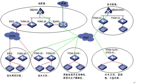 省水利設計院已經(jīng)部署了200門容量的PBX,采用語音網(wǎng)關將PBX及其下掛的模擬電話接入系統(tǒng)后,除了不需要連接水利部語音系統(tǒng)外,其組網(wǎng)與省防總完全一致,與省水利設計院連接的PBX可采用VG80-20,使用2個E1連接。