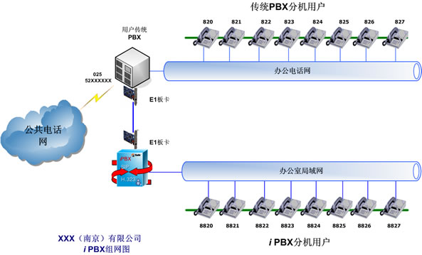該用戶購買eTalk iPBX系統(tǒng)一套,設(shè)置于其所屬開發(fā)中心機(jī)房,利用現(xiàn)存辦公室局域網(wǎng)布設(shè)分機(jī)。通過E1板卡與原有傳統(tǒng)PBX連接,實(shí)現(xiàn)與傳統(tǒng)PBX分機(jī)用戶之間的互相撥打。傳統(tǒng)PBX分機(jī)用戶同時也能享受eTalk