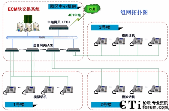 基地先完成機房到桌面的弱電布線,在大樓中心骨干機房,架設一套ECM軟交換系統(tǒng)組建電話通訊網絡。