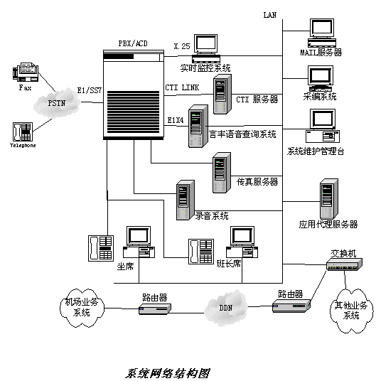 在硬件上系統(tǒng)由語音服務(wù)器、CTI服務(wù)器(含語音卡、TTS服務(wù)器、數(shù)據(jù)庫服務(wù)器、維護(hù)工作站以及相應(yīng)的連接設(shè)備組成。