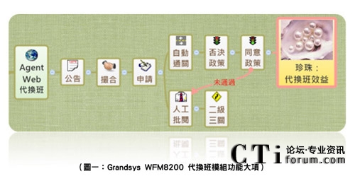 以Grandsys WFM8200為例,其所提供的班務管理模組,允許呼叫中心匯入Excel班表并提供主管以圖形拖拉調(diào)度班務,而客服人員可以瀏覽器,進行代換班之公告、撮合、申請,除了自動比對同意否決政策進行,自動通關的判斷以外,班組長或排班師也可進行人工批閱,可以說是呼叫中心入門的班務管理系統(tǒng)。