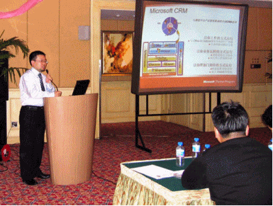 微軟公司負責天津地區(qū)的夏玉玲小姐在簡短的開幕式后首先發(fā)表演講,介紹了微軟為商業(yè)應用開發(fā)的各種商務解決方案(MBS)。其后通用咨詢公司總經(jīng)理鄭明先生上臺演說,其演講主題將營銷管理理論體系與微軟CRM密切結合,博得了與會者贊同的掌聲。