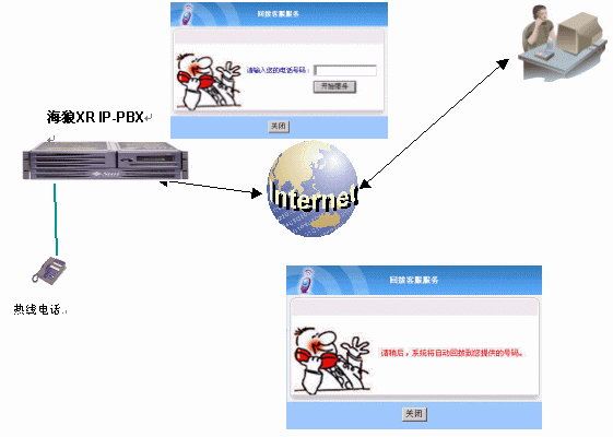如圖:用戶在上網訪問企業(yè)網站的時候,如果需要和企業(yè)進行聯(lián)系,手邊沒有麥克風,就可以使用企業(yè)在網頁上的CALL-BACK800鏈接,點擊后就彈出一個窗口,然后輸入身邊的座機或者手機號碼,點擊開始服務,窗口出現(xiàn)紅色的"請稍候,系統(tǒng)將自動回撥到您提供的號碼" ,稍等一會后,用戶的電話就會被呼叫,接通后就可以和企業(yè)的熱線電話進行溝通?梢詫崿F(xiàn)和WEB800同樣的效果,但是CALL-BACK800相對用戶來說是一個更方便的溝通方式。