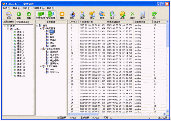 主要是對(duì)錄音進(jìn)行管理,分為錄音查詢和錄音操作兩大部分。錄音查詢除了提供常規(guī)的按條件組合查詢外,還提供了人性化的常用查詢,系統(tǒng)已經(jīng)內(nèi)置了很多常用查詢,例如:當(dāng)日查詢,您只要直接選擇當(dāng)日查詢,就可以馬上開始查詢當(dāng)日的所有錄音,減少您每次輸入查詢條件的工作量,并且還可以靈活的自定義常用查詢,充分滿足您的查詢要求。錄音操作提供了方便快捷的操作方式。批量數(shù)據(jù)的處理能力可以讓用戶以最快的速度從煩瑣的工作中解脫出來。詳細(xì)的記錄信息可以滿足所有用戶的要求,特定信息的加入可以滿足特殊行業(yè)的使用,如呼叫中心行業(yè)、服務(wù)臺(tái)、傳呼臺(tái)等。