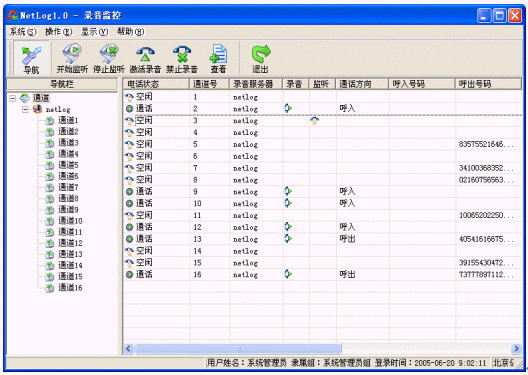 Netlog系統(tǒng)中控制臺(tái)是一個(gè)統(tǒng)一配置和管理的平臺(tái),可以部署在網(wǎng)絡(luò)內(nèi)的任意一臺(tái)主機(jī)上,各個(gè)功能模塊都可以單獨(dú)工作,也可以同時(shí)使用,控制臺(tái)所有模塊可以通過系統(tǒng)導(dǎo)航(ToolBar)來引導(dǎo)啟動(dòng)。用戶可以通過控制臺(tái)操作網(wǎng)絡(luò)上所有記錄服務(wù)、數(shù)據(jù)服務(wù)和文件服務(wù)?刂婆_(tái)作為最終用戶終端可以完成用戶的所有操作,設(shè)置每個(gè)服務(wù)器甚至每個(gè)通道的屬性、執(zhí)行各種用戶操作、指定服務(wù)的工作方式、錄音查詢、錄音管理、輸出報(bào)表、排班等?刂婆_(tái)根據(jù)用戶權(quán)限的不同限定用戶的操作,更好的保障了系統(tǒng)的運(yùn)行和語音記錄文件的安全。