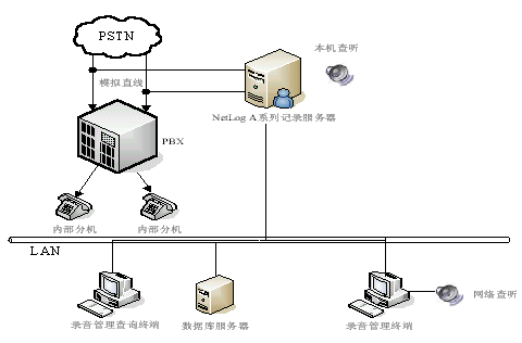 NetLog語(yǔ)音記錄系統(tǒng)采用基于分布式、多層控制管理體系的設(shè)計(jì)思想,將電話線路與內(nèi)部網(wǎng)絡(luò)有效地結(jié)合在一起,形成一套完整的語(yǔ)音記錄、管理系統(tǒng)。NetLog系統(tǒng)包括數(shù)據(jù)服務(wù)、文件服務(wù)、記錄服務(wù)、控制臺(tái);