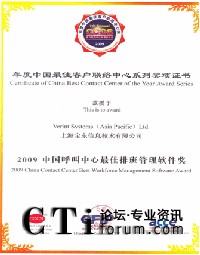 客戶聯(lián)絡(luò)中心標(biāo)準(zhǔn)委員會(huì)層層評(píng)估和共同審定,上海寶東(DataTool)及VERINT雙雙獲得“2009中國(guó)呼叫中心排班管理軟件獎(jiǎng)”,這一大獎(jiǎng)的頒發(fā)是ICMI對(duì)寶東及VERINT的肯定與支持,代表著權(quán)威機(jī)構(gòu)對(duì)VERINT的WFM排班管理軟件在呼叫中心行業(yè)中的貢獻(xiàn)及對(duì)寶東公司技術(shù)服務(wù)能力的認(rèn)可及肯定。