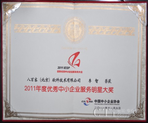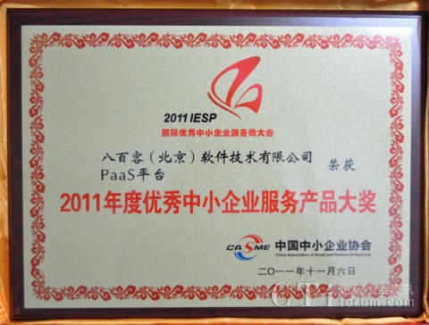 作為國內(nèi)首家SaaS廠商,八百客積極推動云計算在中小企業(yè)中的宣傳與運用。2006年,八百客在國內(nèi)率先推出管理自動化開發(fā)平臺800APP, 它擴展了按需服務(wù),并實現(xiàn)了客戶可根據(jù)需要自定制應(yīng)用程序,成為了改變應(yīng)用程序開發(fā)的一個新途徑。為表彰八百客在中小企業(yè)信息化中做出的杰出貢獻,本次大會特別為八百客頒發(fā)了“2011年度優(yōu)秀中小企業(yè)服務(wù)產(chǎn)品大獎”,此外還授予八百客總經(jīng)理李智 “2011年度優(yōu)秀中小企業(yè)服務(wù)明星大獎”。