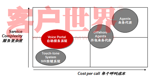讓我們來看看這張圖。這張圖縱軸是服務(wù)的復(fù)雜度,橫軸是單位呼叫成本,傳統(tǒng)的IVR(觸鍵的語音IVR)和人工服務(wù)相比,服務(wù)的復(fù)雜度可就差多了。而Voice Portal的概念是用比較少的成本做更多的業(yè)務(wù),從成本上講比原來的傳統(tǒng)的IVR可能成本稍微高一點點,但是和人工服務(wù)相比,無論是和單位自建呼叫中心座席比,還是和外包呼叫中心座席比,成本都有很大降低,但業(yè)務(wù)復(fù)雜度可以做得比傳統(tǒng)IVR復(fù)雜很多。我們承認(rèn),就提供服務(wù)的內(nèi)容來講,Voice Portal今天仍然不能夠像人工那樣提供那么全面的服務(wù),但是可以涵蓋很多服務(wù)內(nèi)容,在這方面一是因為技術(shù)先進了,另一方面也在于引導(dǎo)。今天我看到越來越多的客戶已經(jīng)開始有意識的推行自助服務(wù)形式。我前幾年去新加坡打出租,發(fā)現(xiàn)在新加坡有很多叫出租的車站,車站上有一個按鍵,按鍵上有一個編碼,說明你在什么位置,當(dāng)你打通出租車客服的電話,你只要告訴這個編碼,他們就自然而然知道你在什么地方,并把要來接你的車車牌號通過語音報讀方式通知你。今天在中國也開始有這種形式了。昨天我沒有開車,也算是支持北京市每周少開一天車的號召,我打了出租,在和出租司機聊天的過程中,出租司機說現(xiàn)在油價很貴,他們有很強烈的需求不愿意掃馬路,他們也有一個出租車叫車電話,那個呼叫中心大概有上百個坐席,這個公司有一萬六千輛出租車在北京,由他們來進行搶答,搶答完之后你可以告訴說這個人在什么地方等,唯一不同的我們在自助化上還沒有做得那么到位,司機搶到了活還要給客戶打一個電話,不象新加坡完全是自助的,你只要按了那個鍵,系統(tǒng)就知道你在什么地方,當(dāng)尋找到合適的車的時候,語音報讀你車牌號就行了。我和說出租車師傅,那你打電話成本不是增加了嗎,他一笑,增加打一個電話的成本怎么也比掃馬路強。大家可以看看呼叫中心多有用,自助服務(wù)能省多少錢。