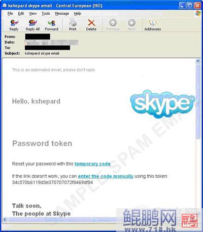 不幸的是,Skype的弱點漏洞在過去也曾被發(fā)現(xiàn)利用,Skype的知名度也同樣地被利用來進(jìn)行垃圾訊息攻擊。下圖所示是目標(biāo)針對Skypeg使用者的垃圾訊息: