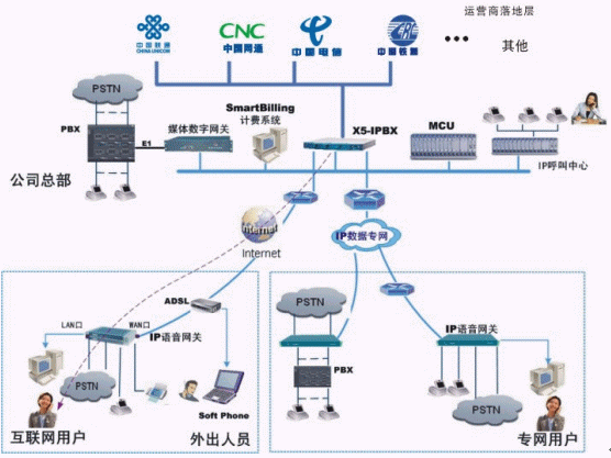 - 中心的X5-IPBX系統(tǒng)可以服務于互聯(lián)網(wǎng)用戶和企業(yè)內(nèi)部數(shù)據(jù)專網(wǎng)用戶,實現(xiàn)雙網(wǎng)匯接,使得不同網(wǎng)絡中的用戶可以實現(xiàn)IP電話通信。