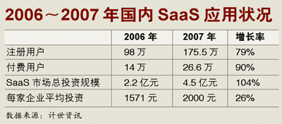 SaaS在中國正步入一個(gè)快速發(fā)展的時(shí)期。計(jì)世資訊調(diào)查數(shù)據(jù)顯示,2007年國內(nèi)SaaS市場在諸多積極因素的刺激下快速發(fā)展,用戶的投資額度和付費(fèi)用戶數(shù)快速增長,使得企業(yè)用戶在在線管理服務(wù)的投入上有較快的增長。2007年企業(yè)用戶在SaaS上的平均投資額度比2006年增長了約26%。2007年管理型SaaS應(yīng)用的總投資規(guī)模為4.5億元,但與2007年管理軟件市場整體規(guī)模248億元比,目前在線管理服務(wù)市場規(guī)模仍然相當(dāng)小。