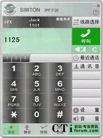 企業(yè)版需要另行購(gòu)買(mǎi),突出的功能包括“電子通信錄”、“軟電話與臺(tái)式電話機(jī)綁定”等。“電子通訊錄”功能已預(yù)裝在軟電話中,就像手機(jī)的通訊薄一樣。企業(yè)的員工不需要自己逐條輸入通訊錄,錄入與更新由企業(yè)的系統(tǒng)管理員在企業(yè)的通訊服務(wù)器上進(jìn)行,一人操作,全公司通訊錄同步更新。一個(gè)集團(tuán)公司或政府機(jī)構(gòu)有成百上千個(gè)員工很正常,但要讓大家記住這幾百個(gè)電話號(hào)碼就很困難了,目前較為常見(jiàn)的解決辦法有以下幾種,小一點(diǎn)的企業(yè)或機(jī)構(gòu)通常會(huì)打印一張通訊錄發(fā)放給每個(gè)員工,員工撥號(hào)前會(huì)先查一下這張通訊錄然后再將電話號(hào)碼在臺(tái)式辦公電話機(jī)上逐個(gè)輸入;規(guī)模大一點(diǎn)的企業(yè)會(huì)專門(mén)印制一本通訊薄發(fā)給每個(gè)員工,但由于機(jī)構(gòu)龐大,往往等到通訊簿發(fā)到手上,其中有很多電話號(hào)碼已經(jīng)不正確了。F20型軟電話的“與臺(tái)式電話機(jī)綁定”功能就很好的解決了這個(gè)問(wèn)題,通過(guò)將電腦上的軟電話與辦公桌上的臺(tái)式電話機(jī)進(jìn)行綁定,企業(yè)中的所有員工在打電話時(shí),都可以先點(diǎn)擊電腦軟電話中的通訊錄,快速找到需要的電話號(hào)碼,然后只需點(diǎn)擊這個(gè)號(hào)碼條,這個(gè)員工的臺(tái)式電話機(jī)就會(huì)自動(dòng)向目標(biāo)電話進(jìn)行撥號(hào),待對(duì)方摘機(jī)后,這個(gè)員工的臺(tái)式電話機(jī)就會(huì)響起鈴聲,此時(shí)摘機(jī)就可進(jìn)行通話了。確實(shí)夠方便,夠?qū)嵱茫?