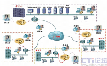 如上圖所示,由于Cisco IPCC是基于標(biāo)準(zhǔn)IP網(wǎng)絡(luò)的純IP呼叫中心解決方案,呼叫中心的核心設(shè)備都只部署在省中心機(jī)房,其它地市只需要在原有網(wǎng)絡(luò)的路由器上添加語音模塊即可實(shí)現(xiàn)PSTN語音的本地接入,而無需再各地市購(gòu)買額外的接入設(shè)備。而同樣由于IP網(wǎng)絡(luò)的特性,呼叫中心的坐席可以根據(jù)需要部署在甘肅省運(yùn)輸管理局IP網(wǎng)絡(luò)可達(dá)的任何一個(gè)地方,各地市的坐席只需要配備IP電話和座席PC即可。來自PSTN的電話根據(jù)用戶在IVR中的選擇和其它路由策略,自動(dòng)分配到最適合的坐席處理,譬如來自白銀的運(yùn)政投訴由白銀市本地的運(yùn)政大廳座席人員處理。