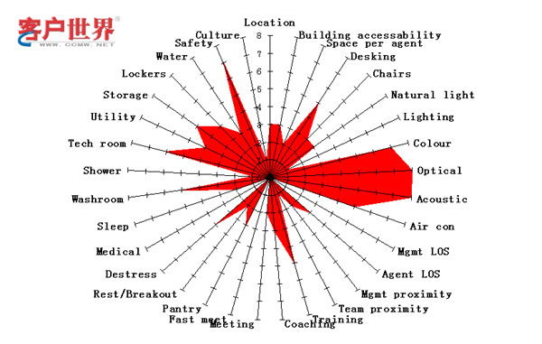 在“環(huán)境”類別之下,包括了與座席代表身心健康、工作便利性和管理有效性有關(guān),體現(xiàn)呼叫中心物理特征的30多個(gè)子項(xiàng)。圖三顯示的就是某個(gè)假想呼叫中心的環(huán)境星狀圖。