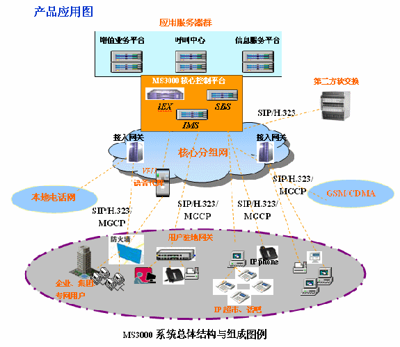 | MS3000核心平臺組成 iEX--IP電話交換機(jī) IMS--綜合管理系統(tǒng) SBS--綜合計費系統(tǒng) VPU--語音代理單元 iTalk--軟電話終端 |