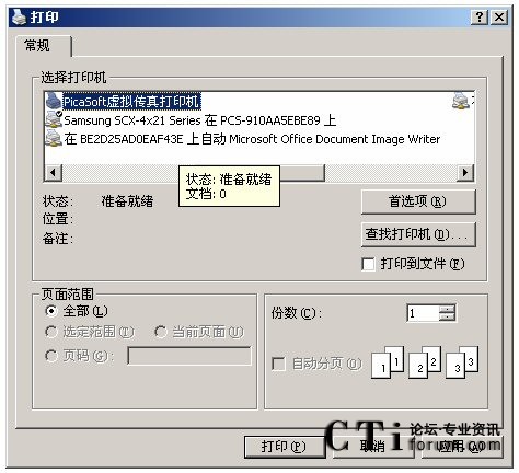 發(fā)送傳真配合PCS的虛擬打印軟件,打開一個文本,或者DOC文件,CTRL+P,選擇“PicaSoft虛擬傳真打印機”,如下圖: