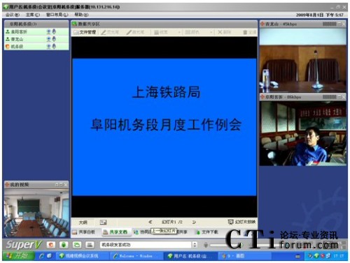 CTI論壇(ctiforum)08月06日消息: 日前,京九干線主力機(jī)務(wù)段——上海鐵路局阜陽機(jī)務(wù)段成功啟動(dòng)視維Super-V視頻會議系統(tǒng)。阜陽機(jī)務(wù)段的領(lǐng)導(dǎo)和職工,每天早上8點(diǎn)上班后,第一件事情就是登陸視頻會議系統(tǒng),匯報(bào)前日工作情況、部署當(dāng)日工作內(nèi)容。已然,山大聯(lián)潤為上海路局阜陽機(jī)務(wù)段部署的阜陽機(jī)務(wù)段視頻會議系統(tǒng),成為鐵路部門必不可少的遠(yuǎn)程溝通交流工具,在有效提高鐵路系統(tǒng)溝通效率的同時(shí),保障了鐵路運(yùn)輸?shù)陌踩,極大滿足了鐵路部門暑期運(yùn)營業(yè)務(wù)對溝通和會議的需求。