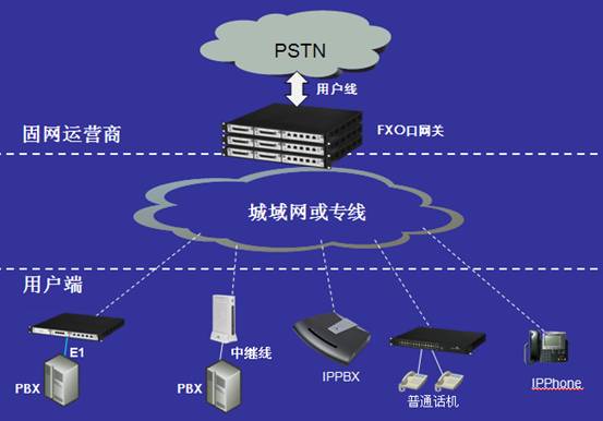 “固網(wǎng)IP化”方案無需軟交換,延用現(xiàn)有的數(shù)字程控交換機與業(yè)務(wù)支持系統(tǒng)作為核心網(wǎng)業(yè)務(wù)平臺,只是在交換機外圍增加實現(xiàn)模擬/數(shù)字語音信號轉(zhuǎn)換成IP的VoIP網(wǎng)關(guān),并通過IP網(wǎng)絡(luò)實現(xiàn)與遠(yuǎn)程客戶終端設(shè)備的連接。遠(yuǎn)程的用戶端設(shè)備可以是傳統(tǒng)設(shè)備,如普通電話、傳真機或小型交換機,也可以是基于IP的語音設(shè)備,如SIP電話、IPPBX等(如下圖所示)?梢詫崿F(xiàn)小區(qū)放號、企業(yè)直線電話、企業(yè)語音交換機接入等業(yè)務(wù)。