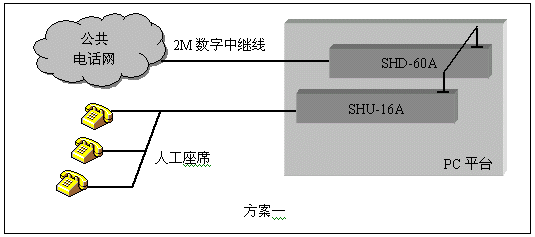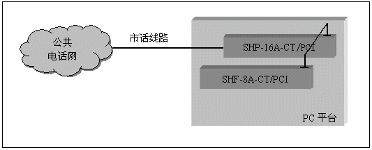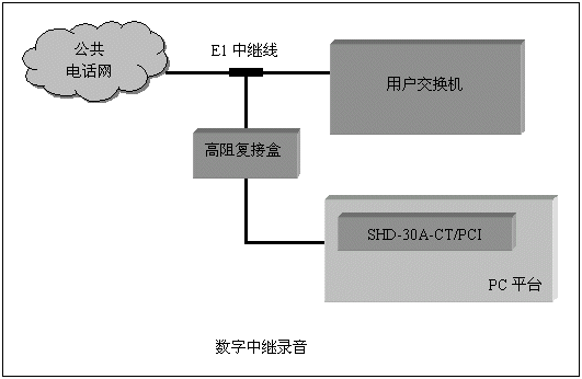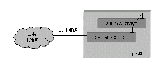 通道數(shù)較多的大中型應用系統(tǒng),一般采用數(shù)字中繼線(E1)接入公共電話網(wǎng),三匯公司的SHD系列數(shù)字中繼卡可以提供相應的解決方案。SHD系列數(shù)字中繼在一塊卡上集成了E1線接口,語音資源,信令處理等所必須的全部功能,其接入信令處理模塊可處理中國1號信令(SS1),7號信令(SS7),ISDN PRI協(xié)議(DSS1),單塊卡最多可支持4個E1接入。通過CT-BUS(或ST-BUS)總線,還可以在數(shù)字中繼線上實現(xiàn)傳真功能。典型應用結(jié)構(gòu)如下圖: