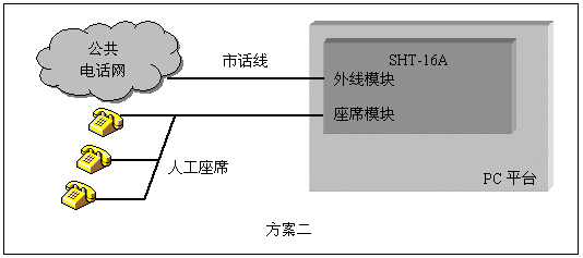 人工座席是呼叫中心(Call Center)一類應用的主要組成部分。三匯語音卡對人工座席提供了兩套解決方案:使用SHU系列座席卡,通過交換總線與其它卡互聯(lián),為整個系統(tǒng)提供座席資源。使用SHT系列模塊化語音卡,在部分通道使用座席模塊,可用單塊卡實現(xiàn)座席和外線系統(tǒng)。第二種方式特別適用于小型呼叫中心,總機話務員等應用。三匯公司的座席通道可以直接連接各類普通電話機,利用座席卡配置相應的軟件,還可以構(gòu)成板卡交換機,完全取代企業(yè)用戶交換機。這類應用的典型結(jié)構(gòu)如下圖:
