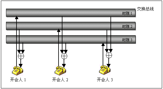 由于會(huì)議的資源是分布在各個(gè)通道,因此電話會(huì)議功能可以具有極大的靈活性,只有一塊卡的小系統(tǒng)也可以擁有電話會(huì)議功能,既可以召開所有通道參加的大會(huì)議,也可以同時(shí)召開一系列參加人數(shù)不同的小會(huì)議,會(huì)議功能的各項(xiàng)指標(biāo),如會(huì)議數(shù)目,會(huì)議參加人數(shù),發(fā)言人數(shù)等基本上都不受限制。下圖以一個(gè)三方會(huì)議的實(shí)現(xiàn)說明分布式電話會(huì)議的概念。