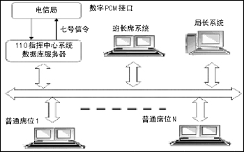 系統(tǒng)由以下部分組成:CTI服務(wù)器、接警席位系統(tǒng)、班長(zhǎng)席位系統(tǒng)、局長(zhǎng)席位系統(tǒng)。各部分系統(tǒng)可根據(jù)實(shí)際需求任意組合,各個(gè)部分充分考慮到開(kāi)發(fā)的實(shí)用性、可靠性、先進(jìn)性和開(kāi)放性,能夠?qū)④浖S護(hù)降到最小程度,這樣的設(shè)計(jì)可以讓用戶能夠改動(dòng)硬件和數(shù)據(jù)庫(kù),卻不用將軟件整體更換,保證了用戶的投資。其結(jié)構(gòu)如圖2所示。