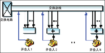 系統(tǒng)集中提供一組或多組電話會(huì)議資源,然后利用交換總線將所有需要參加某個(gè)會(huì)議的話路交換至特定的電話會(huì)議資源,從而實(shí)現(xiàn)會(huì)議應(yīng)用。如圖1所示。