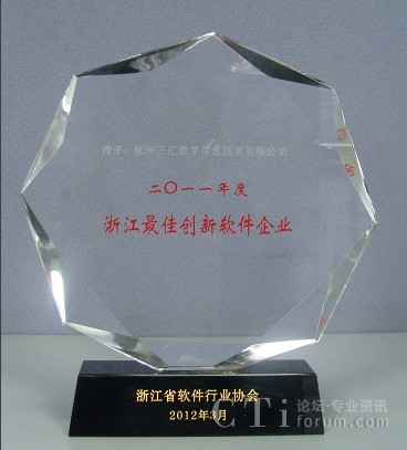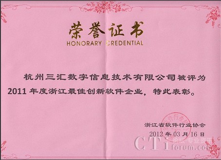 杭州三匯獲“2011年度浙江最佳創(chuàng)新軟件企業(yè)”殊榮