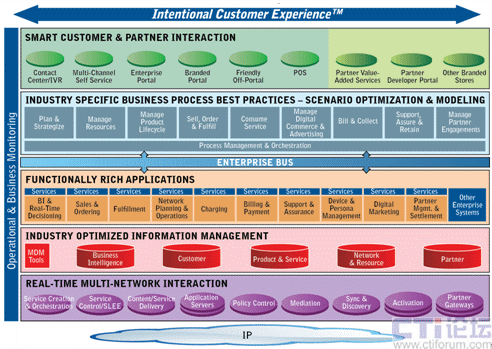 其次,CES改變了現(xiàn)有的業(yè)務(wù)應(yīng)用層將功能和流程融合在一起的模式,對流程和功能進(jìn)行了分離。實(shí)際上,應(yīng)用功能和流程結(jié)合得越緊密,系統(tǒng)的適應(yīng)性就會(huì)越差,對新業(yè)務(wù)和新產(chǎn)品的響應(yīng)時(shí)間就越長,CES將業(yè)務(wù)應(yīng)用層分為流程層和應(yīng)用功能層,流程和功能的分離極大的提高了系統(tǒng)靈活性,降低了系統(tǒng)集成的復(fù)雜程度和成本開銷,滿足了新業(yè)務(wù)和新產(chǎn)品快速上市的要求。在流程層,運(yùn)營商不僅可以選擇采用Amdocs在25年服務(wù)經(jīng)驗(yàn)的基礎(chǔ)上總結(jié)的業(yè)界最佳實(shí)踐的業(yè)務(wù)流程,也可以選擇采用企業(yè)現(xiàn)有的業(yè)務(wù)流程;在應(yīng)用功能層,Amdocs全系列軟件產(chǎn)品將更加模塊化,運(yùn)營商可以選擇Amdocs全系列軟件產(chǎn)品,也可以選擇其中的個(gè)別或部分產(chǎn)品,這種高度模塊化的產(chǎn)品將以更快的速度集成到運(yùn)營商已有的IT框架中。