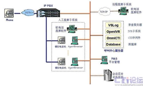 本方案采用IP-PBX 硬件平臺配合CTI系統(tǒng)軟件來建設(shè)呼叫服務(wù)系統(tǒng)。IP-PBX作為坐席接入的硬件接口平臺,采用上海傲威科技有限公司自主研發(fā)的IP-PBX產(chǎn)品AVX2000pro來實現(xiàn),AVX2000pro提供標準RJ11固件接口,為坐席員提供語音接入,坐席員耳麥話機直接與RJ11接口互連。坐席電腦通過局域網(wǎng)口與CTI軟件服務(wù)系統(tǒng)互連。