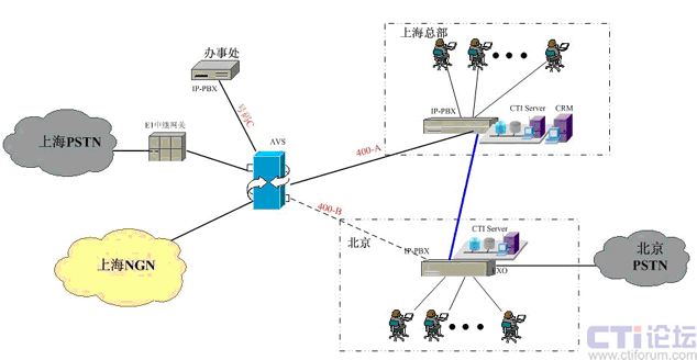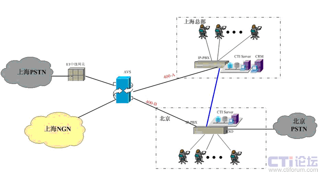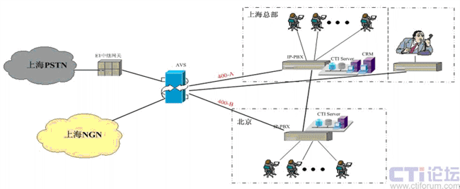 在上海采用傲威通信的AVS軟交換平臺(tái)實(shí)現(xiàn)VoIP呼叫系統(tǒng)的主叫識別,決定呼叫路由的選定。在上海和北京分別建設(shè)IP-PBX和CTI呼叫系統(tǒng),在各辦事處或分公司可根據(jù)選擇是否要建設(shè)坐席或普通電話系統(tǒng),所有節(jié)點(diǎn)的呼入呼出統(tǒng)一從上海出口實(shí)現(xiàn)出入。