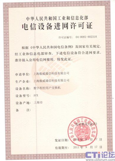 傲威通信AVX系列語(yǔ)音電話交換機(jī)獲得“電信設(shè)備進(jìn)網(wǎng)許可證”