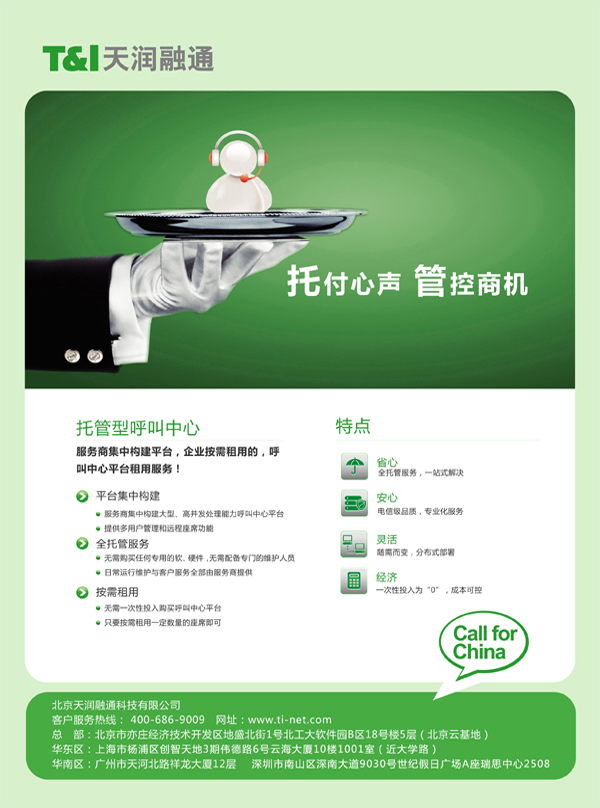 北京天潤融通科技有限公司致力于為企業(yè)提供簡單、易用、可依靠的托管型呼叫中心服務(wù),幫助企業(yè)更好地經(jīng)營其客戶資源。天潤融通是國內(nèi)呼叫中心領(lǐng)域內(nèi)領(lǐng)先的“云應(yīng)用”提供者。先后承接了百度全國客服中心、平安保險北京客服中心、慧聰網(wǎng)呼叫中心、央視網(wǎng)絡(luò)客服中心、安博教育客服中心、圓通快遞客戶服務(wù)中心、飯統(tǒng)網(wǎng)客戶訂餐中心等大型的呼叫中心項目。服務(wù)的客戶遍及互聯(lián)網(wǎng)、教育培訓(xùn)、金融服務(wù)、旅游票務(wù)、電子商務(wù)、食品飲料、醫(yī)療保健、消費品制造和銷售、物流、餐飲娛樂、電視購物等十多個領(lǐng)域達(dá)數(shù)千家企業(yè)客戶。