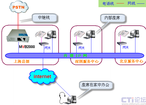在技術(shù)上,MVB2000 的語音業(yè)務通過電信運營商的模擬或者數(shù)字中繼線路接入,數(shù)據(jù)業(yè)務都通過局域網(wǎng)或者互聯(lián)網(wǎng)使用TCP/IP協(xié)議傳送,解決了呼叫中心中大量數(shù)據(jù)傳送的需求,請看下面的網(wǎng)絡(luò)組織結(jié)構(gòu)圖: